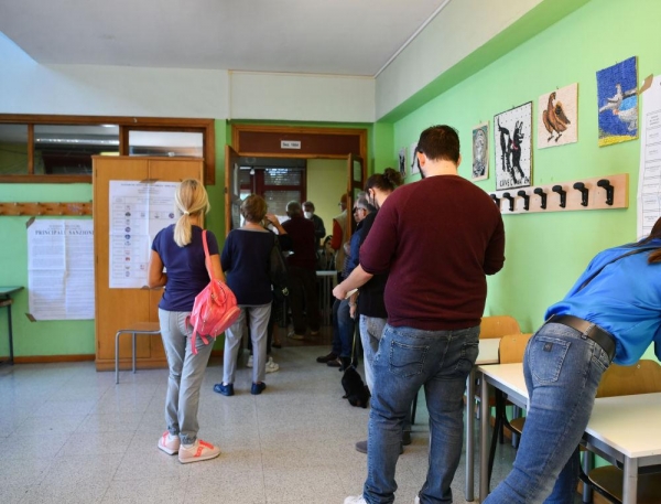 9月25日,选民在意大利罗马一处投票站等待投票。图片来源:新华社