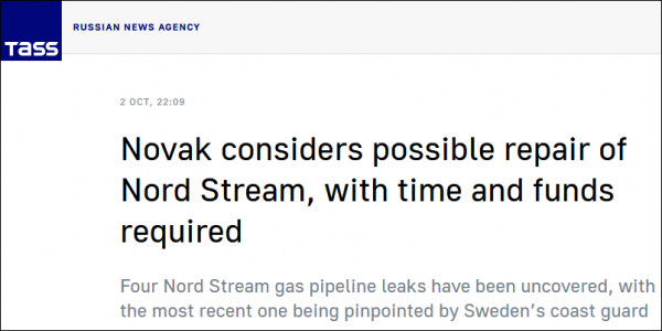 【文/观察者网 熊超然】据俄罗斯塔斯社当地时间10月2日报道,俄罗斯副总理诺瓦克当天在参加一档新闻节目时表示,在技术层面,修复日前出现泄漏的"北溪1号"和"北溪2号"天然气管道是有可能的,但这需要大量的时间和资金。