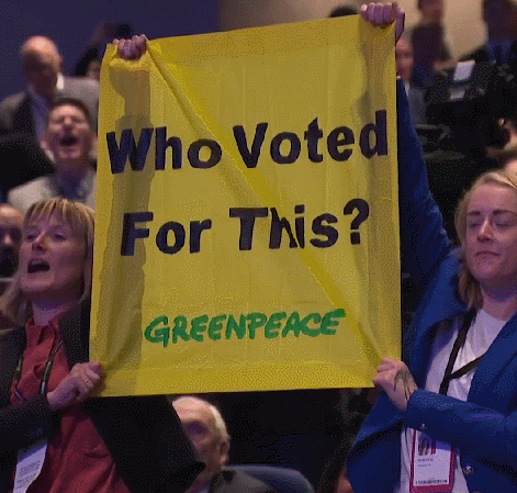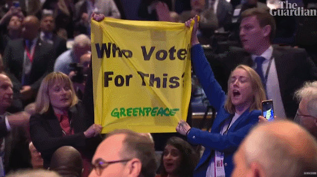 据报道,当时,特拉斯正在阐述她的经济政策的理由,站在伯明翰会议大厅里的"Greenpeace"英国分部的公共事务负责人丽贝卡·纽瑟姆(Rebecca Newsom)和政策官员艾米·麦卡锡(Ami McCarthy),突然大声质问特拉斯:"谁投票支持这个?"她们的手中还举着一个横幅,其上印着同样的话。