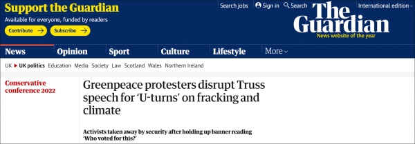 而对于这次抗议活动,"Greenpeace"则在推特上表示,他们的活动人士打断特拉斯的演讲是为了"谴责首相'撕毁'她所在政党2019年的竞选宣言承诺"。该组织表示,特拉斯在水力压裂、气候行动和环境保护方面的政策正在"180度大转弯",并质问"谁投的票"。