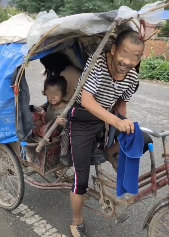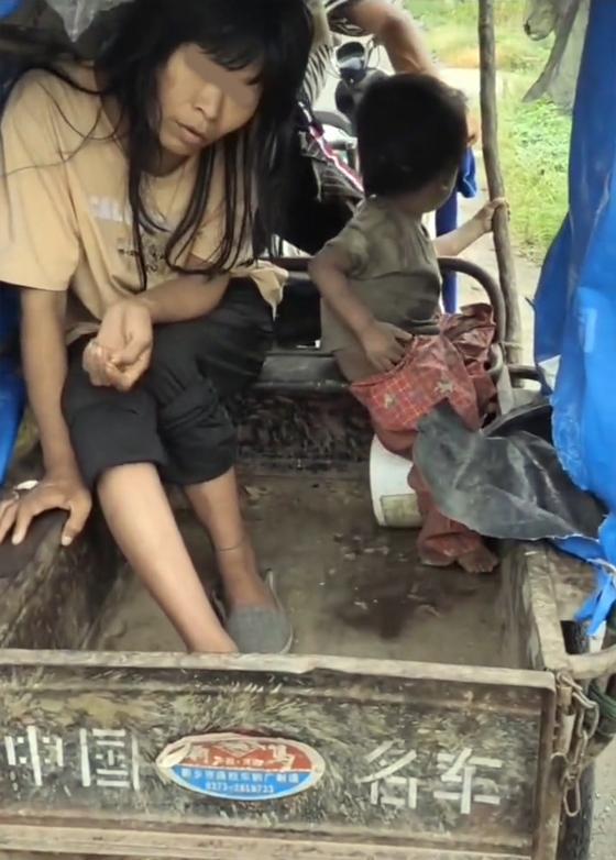 在破破烂烂的人力三轮车上坐着一对母子,女子的眼神有些涣散,怔怔地望着地面发呆,而地面上根本就是空无一物,放空就是她的日常状态。