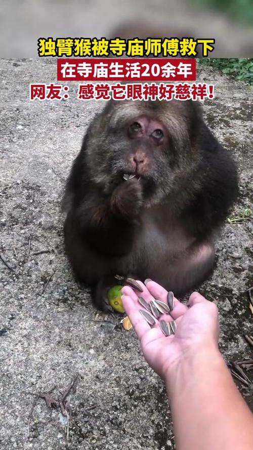 因为性情温顺还被奉为寺庙的吉祥物,大量游客因为它慕名前往就为了一睹独臂小猴子的尊容,小猴子就乖乖坐在地上不争也不抢。只见这独臂小猴子还会吃瓜子,可爱的模样甚是乖巧。