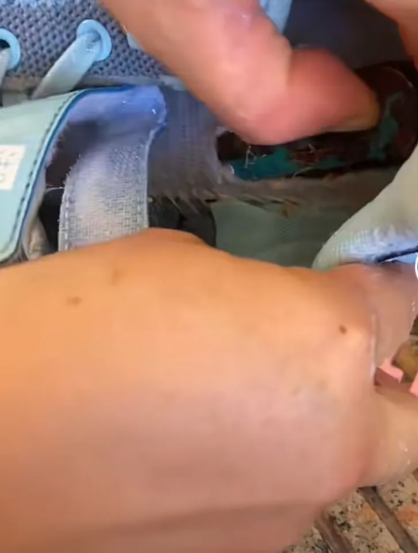 直到这位妈妈买鞋给孩子穿,而平时孩子在穿的时候估计也是没有发现异样,直到鞋子脏了,妈妈在清洗鞋子的时候才发现鞋底异常。