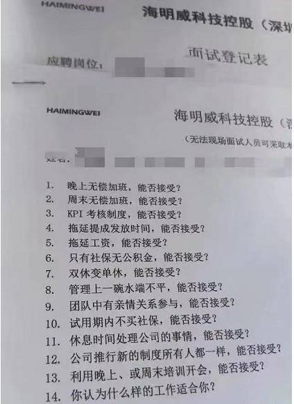 近日,一张海明威科技控股(深圳)有限公司面试登记表在网上流传。