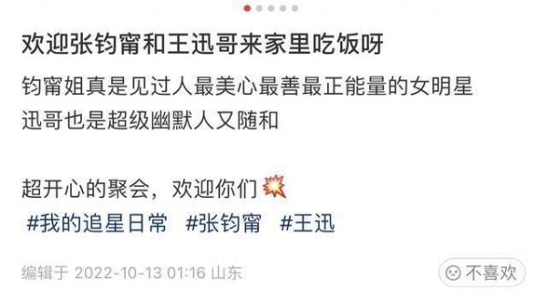 10月13日凌晨,有一位美女富婆在社交平台上晒出她和演员王迅、张钧甯聚餐的照片,此事引起网友关注。
