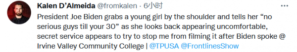还有人提到,这不是拜登第一次对女性做出不当举动,"问个严肃的问题……他为什么总是这样做?我不知道看过多少个他叫小女孩'长大之前不要约会'的视频,这简直太奇怪了。"