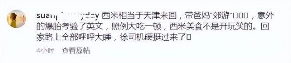 徐静蕾配文:西米相当于天津来回,带爸妈郊游,意外的爆胎考验了英文,照例大吃一顿,西米美食不是开玩笑的,回家路上全都呼呼大睡,徐司机硬挺过来了。