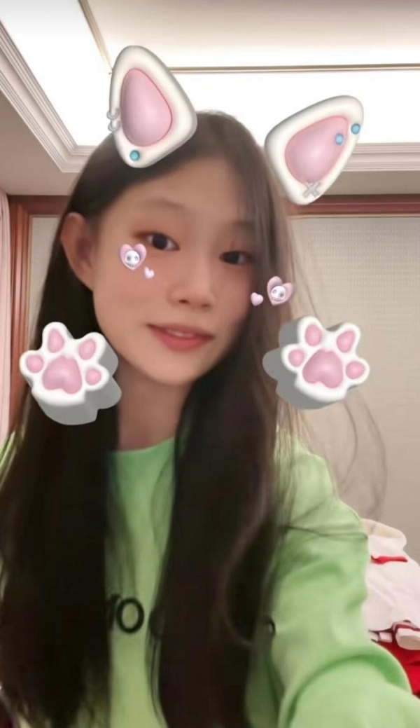 晒出的视频中,沈佳润穿着绿色的卫衣,披散着的头发显得温柔有气质。只见她用着小猫特效,自信地看向镜头,整个画面看起来温馨可爱。