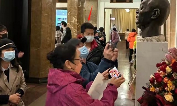 这张照片中,康康戴着口罩站在人群中心,他剃着寸头,眉头紧皱,鼻梁高挺,从外表来看,还是更像爸爸胡军。