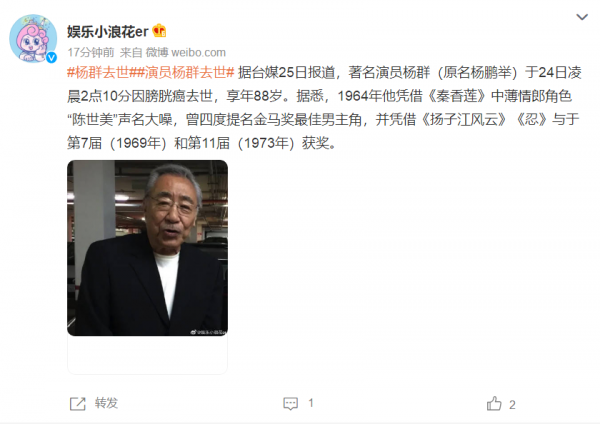 10月24日,不幸的消息传出,知名演员杨群在当日凌晨2点10分因膀胱癌去世,享年88岁。据此前的报道他患癌症已经有一年多的时间,最后由于癌细胞扩散至肺部不治去世。