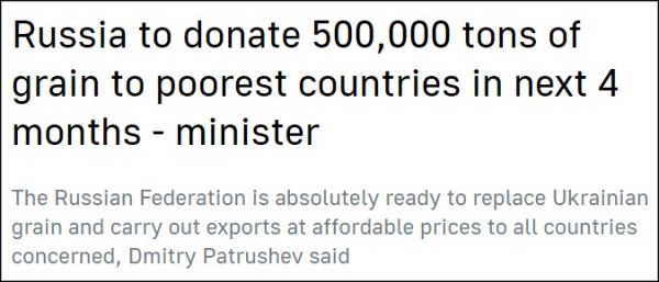 但与此同时,俄罗斯也提出了一项新的粮食援助计划。俄农业部长德米特里·帕特鲁舍夫29日宣布,在"可靠伙伴"土耳其的协助下,俄罗斯准备在未来4个月内向最贫困的国家免费提供50万吨粮食。他还表示,根据今年的收成,俄方已经准备好取代乌克兰,以可负担的价格向所有相关国家出口粮食。