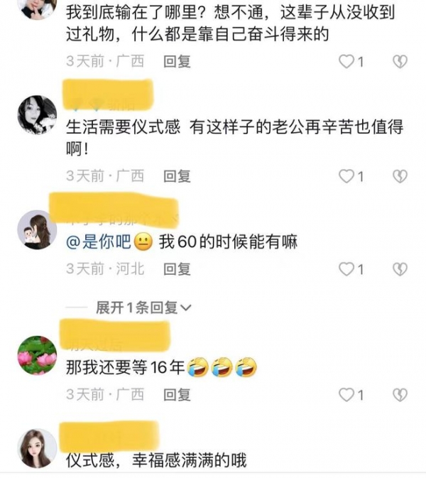 甚至还有网友说,以前总觉得搞这些浪漫的花样,只有那些年轻人,还有那些养尊处优的城里人,看来搞这些浪漫真的不分年龄,也不分是城里人还是农村人。真的很羡慕视频中的大妈,有个对她如此好的老公。