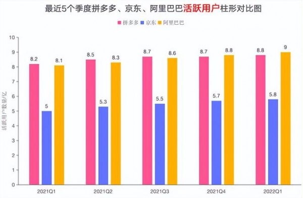2015年上市首年,拼多多用户量就突破了2000万,2016年增长5倍用户扩大至1亿,2022年用户量已经接近9亿,已经超过淘宝,而同年京东用户量仅5.8亿。