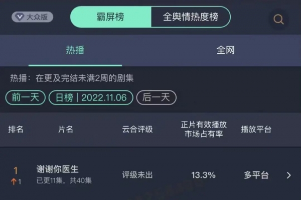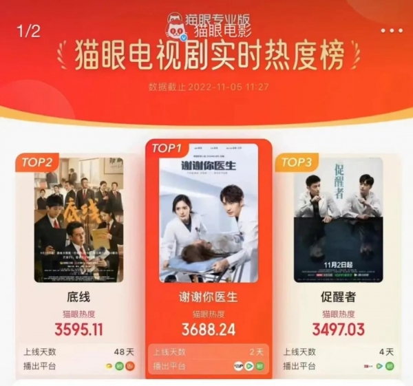 与此同时,《谢谢你医生》在猫眼电视剧热度榜的排名也顺利升至了第一。