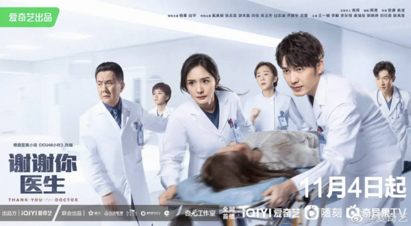 终于,11月4日晚, 杨幂、白宇领衔主演的医疗剧《谢谢你医生》空降开播 ,这部剧不仅在腾讯和爱奇艺联合网播,还被央视八套的黄金档"抢"了去,就连定档和宣传,都是CCTV电视剧的账号全权负责,官微只能当"辅助"。