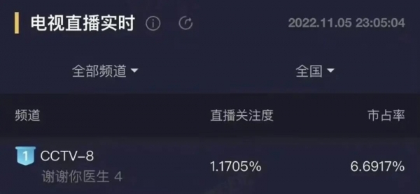从电视的收视数据来看,《谢谢你医生》表现不错。 开播当晚收视率直接破1,第二天更是一路走高,峰值达到了1.4。