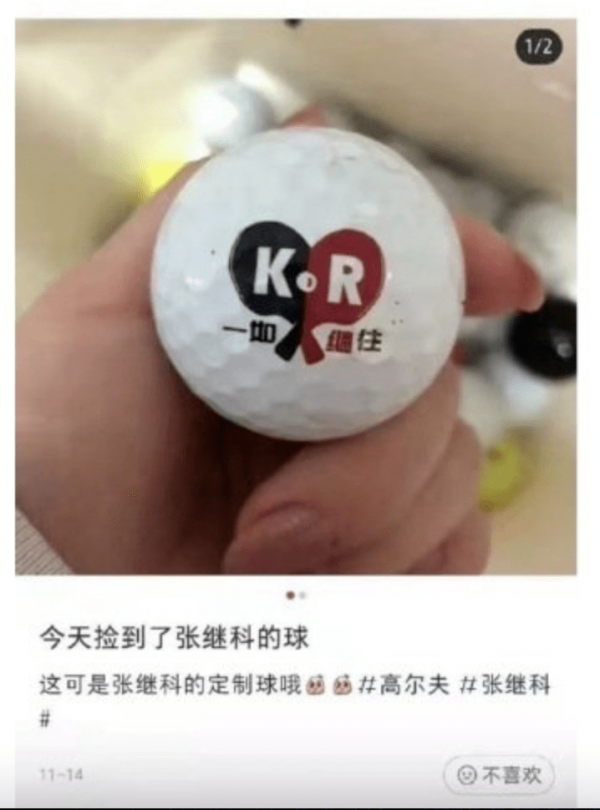 除此之外,有网友还说自己捡到过张继科的定制高尔夫球。球上印着黑红双色乒乓球拍的图案外加"K"和"R"字样,也不难让大家联想到张继科和张蕊二人。
