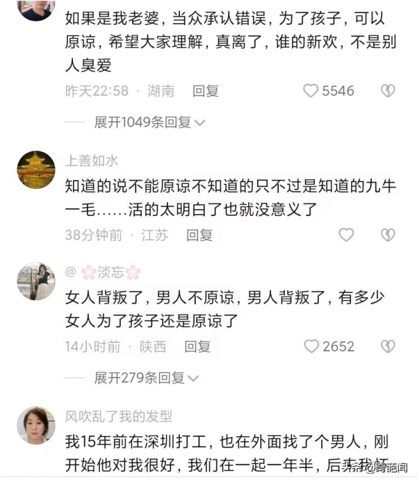 还有网友评论说,要么就别做,做了就别让人发现,发现了就不会得到原谅,即使原谅了也是一道永远抹不去的疤。