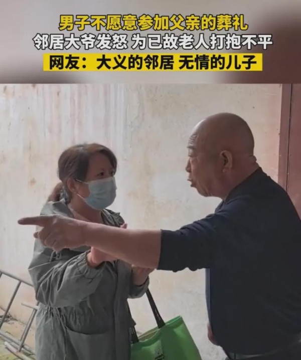 从大爷的表情看,对男子很不满意。大爷认为,儿子对父亲再有意见,再不满,是父亲把你带到这个世界,是他把儿子抚养成人。父亲走了,儿子有义务有责任送父亲最后一程。