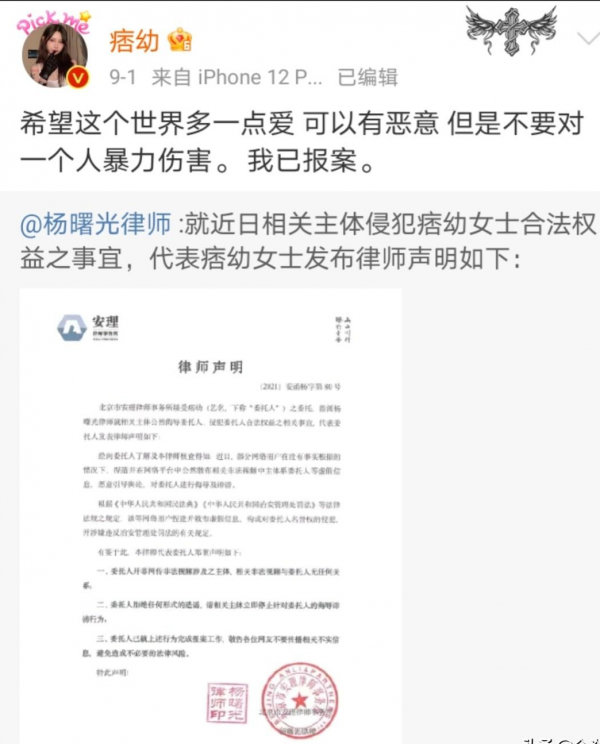 因此,痞幼还委托了律师发表声明,表示已经报案,希望这个世界多点爱,不要恶意暴力伤害。