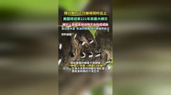 预计从4月中下旬至6月份,这些蝉将会陆续出土,影响美国17个州,其中印第安纳州、伊利诺伊州中部会同时出现两种周期蝉,届时将会让美国迎来史无前例的"蝉灾"。