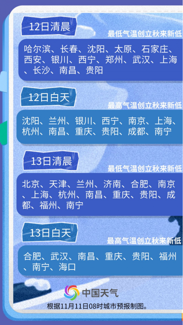 后天清晨,江淮、江南、西南的最低气温下降,安徽北部、江苏西北局地最低气温会降至0℃以下,江西北部、浙江大部等地最低气温降至10℃以下,北京、天津、兰州、济南、合肥、南京、上海、杭州、南昌、重庆、贵阳、成都、福州、南宁最低气温创新低。