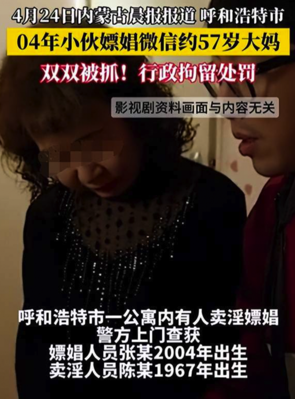 内蒙古一名20岁精神小伙通过微信以500元价格,约嫖一名57岁大妈。被警方在双方约定的公寓内现场抓获。大妈陈某,1967年生,家住黑龙江多年以来一直在呼和浩特从事卖淫违法行为,被公安机关打击处理过。