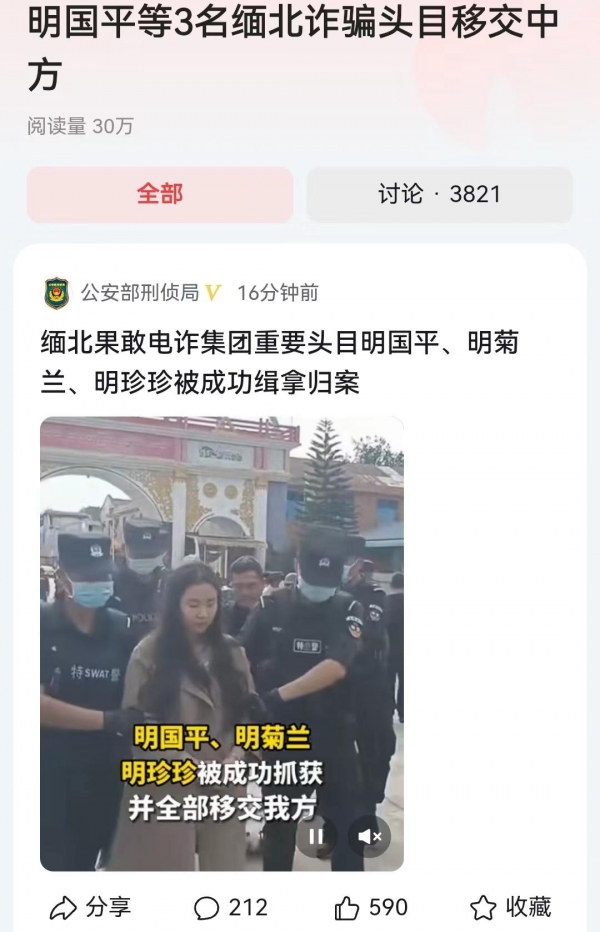 16日传出喜讯,缅北电诈犯罪团伙的幕后最重要人物明国平、明菊兰、明珍珍被缅甸抓获,并且移交我方面。在此之前,他们的幕后老大明学昌已经被抓获,而且被移交。也就是说在我们发出通缉令之后,到目前为止,明氏家族已经一网打尽。