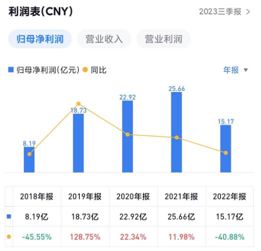 归母净利润,则从2018年的18.7亿元增长至25.7亿元后,在2022年下滑至15.2亿元。