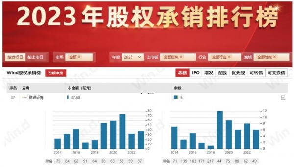 Wind显示,截至11月13日,财通证券的股权承销总金额达到37.68亿元,在券商中排名第37名。其中,IPO项目承销金额超过27亿元,排名第22名。