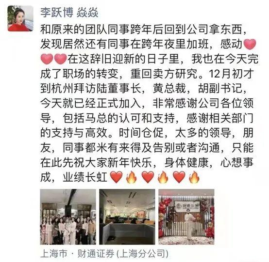 2021年,李跃博跳槽到德邦资管工作半年不到后,又加入财通证券担任研究所所长。其曾发朋圈感慨道,"在这辞旧迎新的日子里,我也在今天完成了职场的转变,重回卖方研究。"