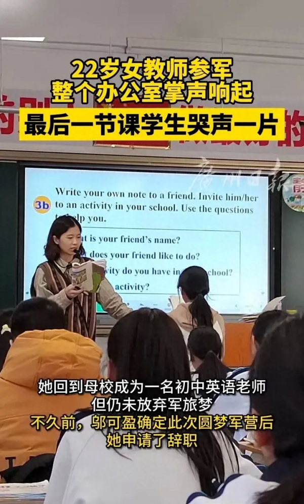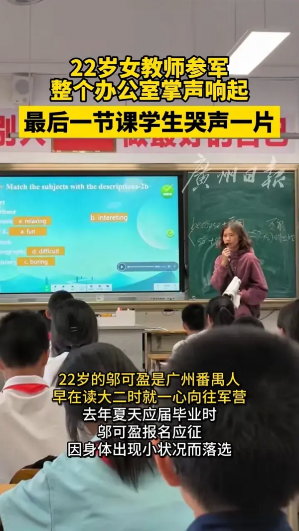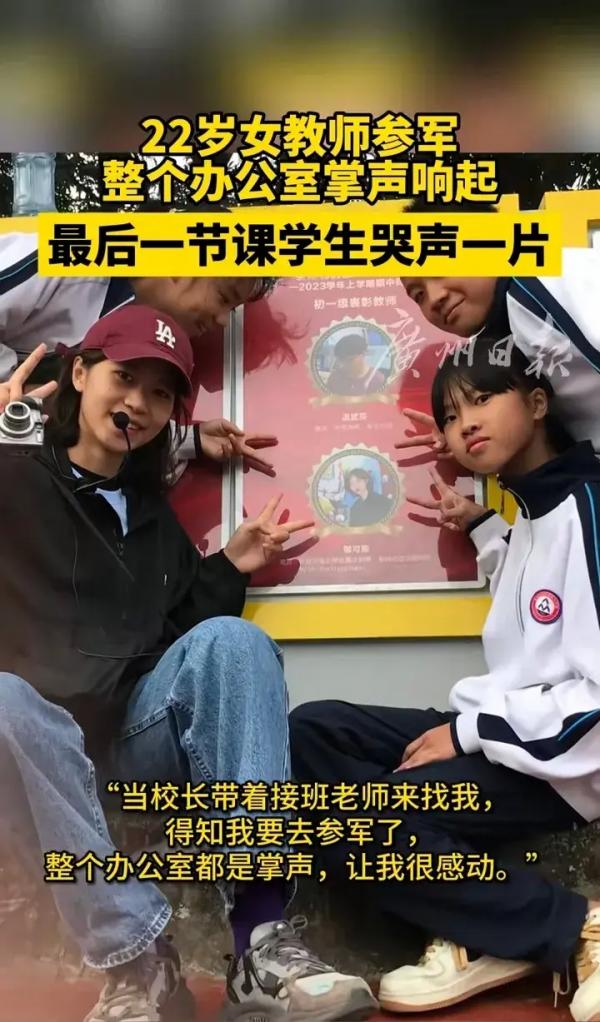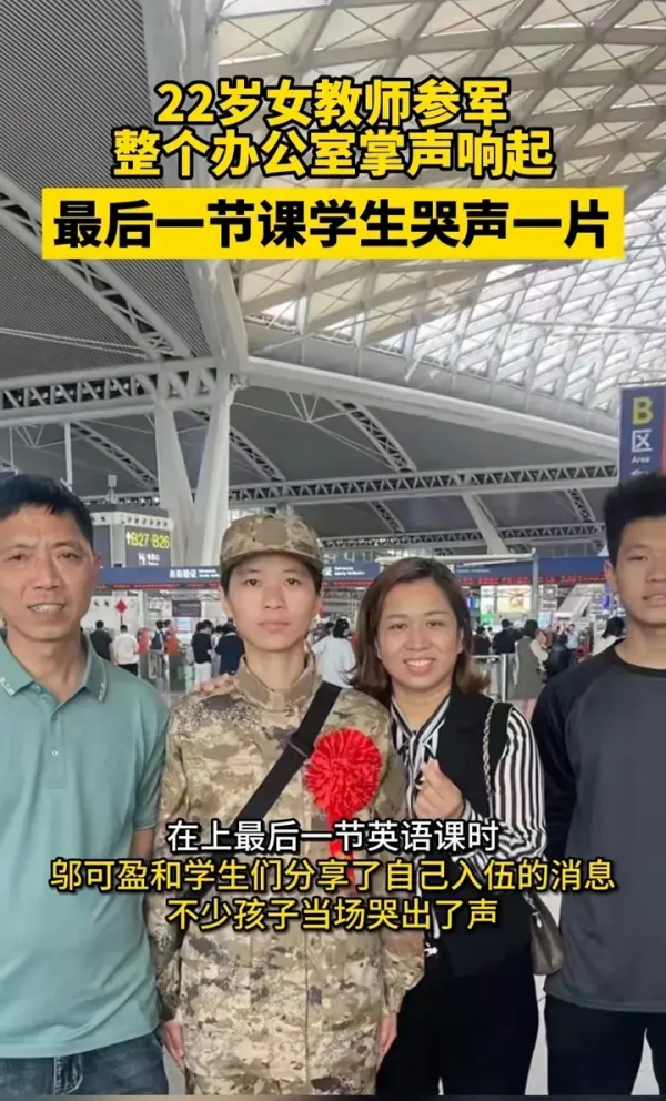 当邬可盈学校的校长带着接班老师到办公室来找她时,她才知道自己要去参军了,办公室的同事们纷纷祝福她,用热烈的掌声赞美了她的壮举,表达了对她的鼓励与祝福!"整个办公室都是掌声,让我很感动。"邬可盈说。
