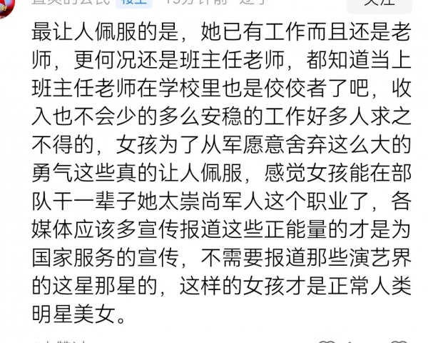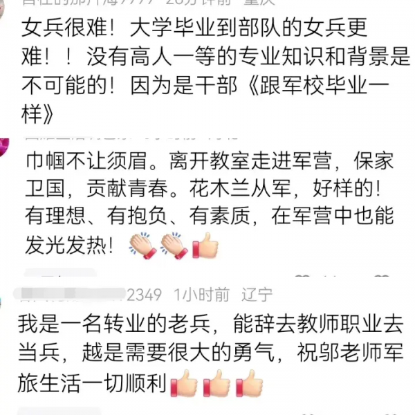 邬老师在入伍之前,咨询了她在军营的表哥,表哥对她的选择给予了坚定的支持!