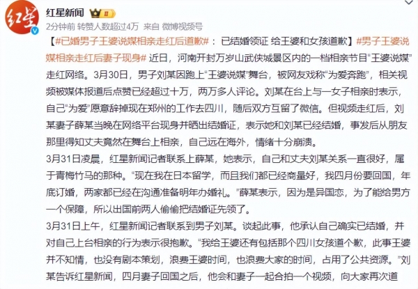 目前,已婚男子已承认自己结婚的事实,并对自己以已婚身份上台相亲的行为表示抱歉。