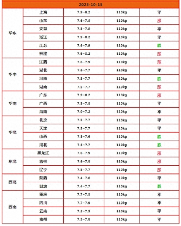 从市场反馈显示,受屠企调价收猪,10月15日,猪价窄幅上涨0.02元,外三元猪价涨至7.64元一斤,猪价呈现波动偏强的走势,国内市场上涨范围有所减少,其中,在江苏、河南、山西、河北、甘肃地区,多地猪价冲高回落,而在京津、川渝、云贵、浙江、上海以及广西、湖北等地,猪价企稳现象增多,上涨表现逐步减弱!