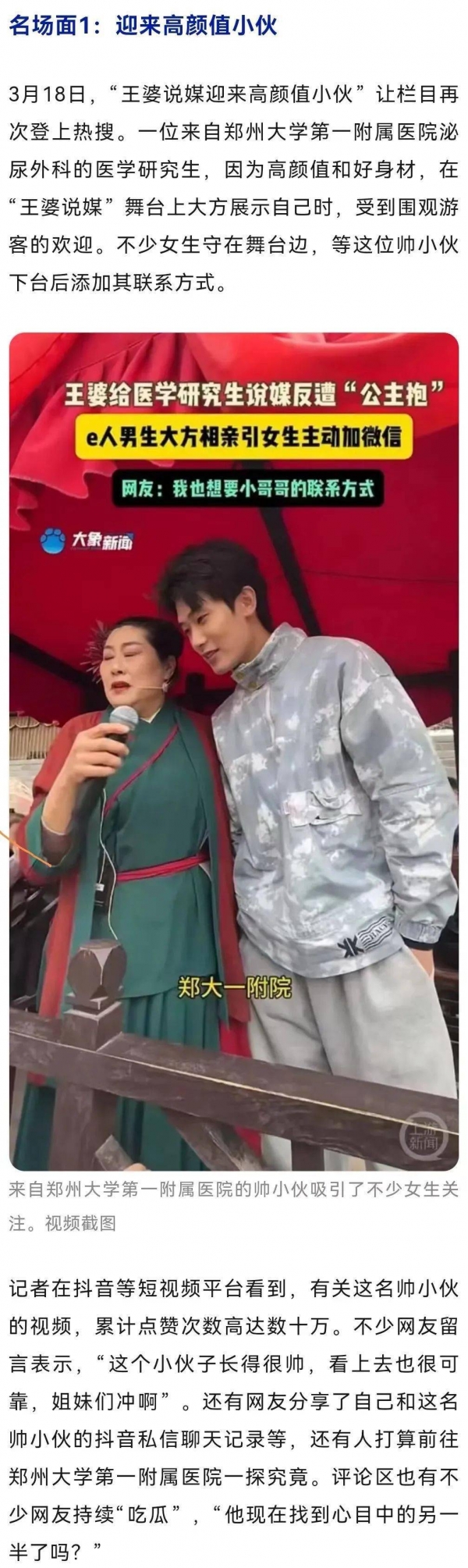 21日下午,大宋武侠城方面告诉记者,"王婆"是景区的工作人员,在此已经工作六七年了,"她每天要组织两场相亲,上午10点半一场,下午3点一场。现在景区人流量也增加了不少,主要是年轻人,看热闹和相亲的都有,很多人一早就开始排队了。"