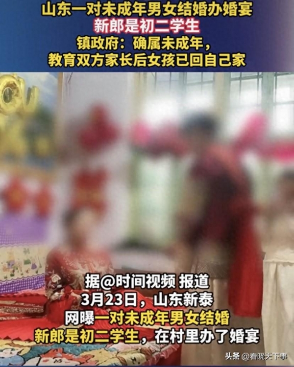 根据时间新闻报道,在山东新泰,网曝一对未成年结婚,新郎是一位初二的学生,在村里办了婚宴。