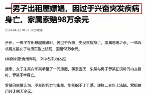 男子出租屋嫖娼 因过于兴奋突然死了,家属索赔98万