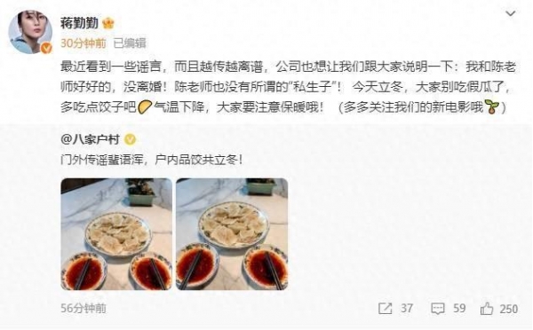 蒋勤勤在社媒上发文表示,她和陈建斌的感情一直很和谐,没有任何问题,更不存在所谓的私生子。