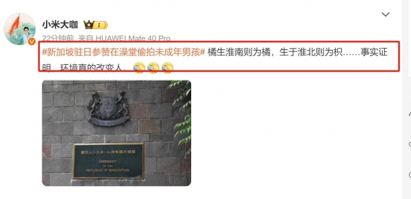新加坡驻日本大使馆在回应该媒体的置评请求时表示,该男子"已于4月12日结束任期",目前已经回国。使馆方面还称,对偷拍事件"不知情"。
