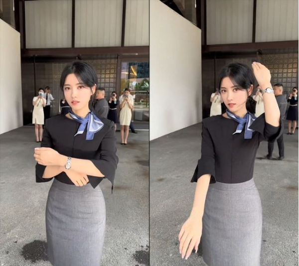 视频画面中这位女销售把职业装穿的非常干净利落,只见她上身穿着黑色的寸衫系着淡蓝色丝巾,搭配下身灰色包臀裙、肉丝以及高跟鞋,不仅整体透露出成熟的感觉,而且还拥有时尚女王风范,简直魅力十足。