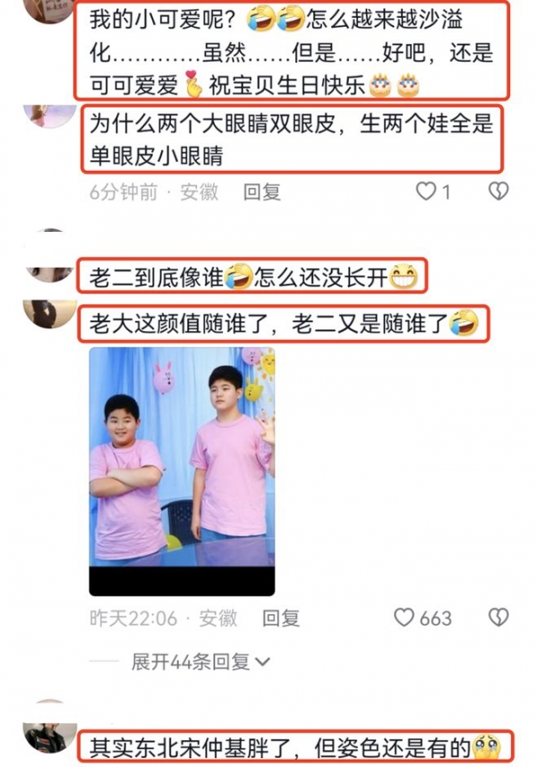 网友焦急地问老二到底随了谁,怎么还没有长开?为什么两个大眼睛双眼皮的父母,生两个娃全是单眼皮小眼睛?我的小可爱怎么越来越沙溢化了?