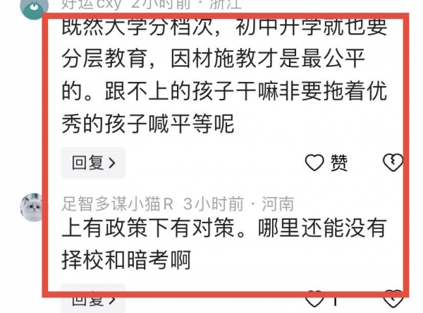 分班如果只是因材施教是可以接受的,但现在分班就好像直接被放弃了。所有资源都倾向重点班,这是很不公平的。