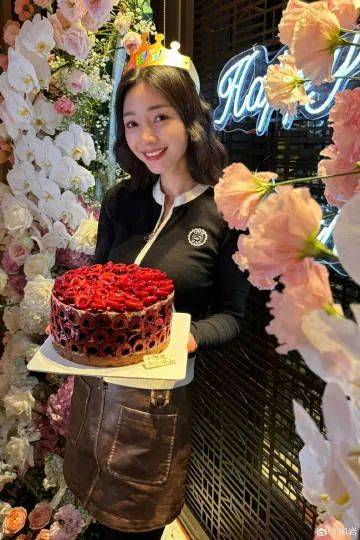 她手捧红色的水果蛋糕,在鲜花簇拥下笑容温婉,而且把自己遮得很严实,一点事业线不露。