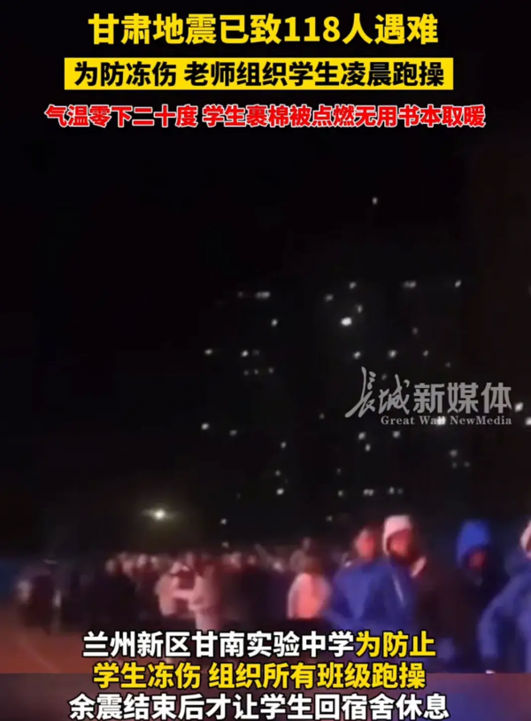 近日,甘肃地震的可怕灾害已导致118人不幸遇难。在这场突如其来的灾难中,一所位于距离震中最近的积石山县积石中学成为了希望之光。为了防止学生冻伤,老师组织学生凌晨跑操,在零下二十度的严寒中,孩子们裹着被子点燃无用书本取暖,互相依偎在一起寻求温暖。