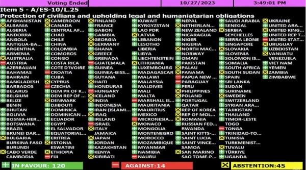 在此后的联合国大会紧急会议上,谴责一切针对巴以两国平民的暴力行为,呼吁立即实施人道主义休战的提案以压倒性优势通过了决议。G7内部却出现了耐人寻味的一幕:一共7个国家,却展现出了3种态度,法国赞成,美国反对,剩下的五个成员国则投了弃权票。
