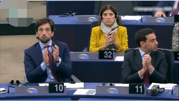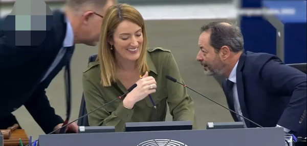 镜头切到欧洲议会主席萝伯塔·梅措拉时,她没忍住笑出了声。