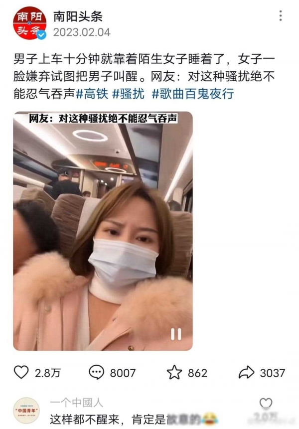 女生高铁被人靠肩睡着 看颜值悟了