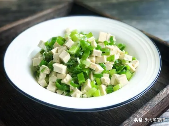 ②豆腐装入盘中,加食盐、鸡精、香油,撒上葱花,烧一些热油浇在葱花上,拌匀即可。