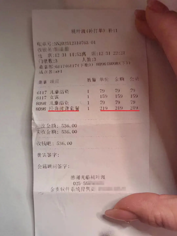 据了解,当孙女士结账时,发现账单上竟然有一项219元的搓背套餐费用。感到惊讶的她仔细询问后发现,这是自己的儿子在洗澡过程中被一名服务人员带去享受的搓背服务。对于这一意外消费,孙女士表示十分不解,因为她从未授权洗浴中心为儿子提供此类服务,更没有听说过有这项收费。